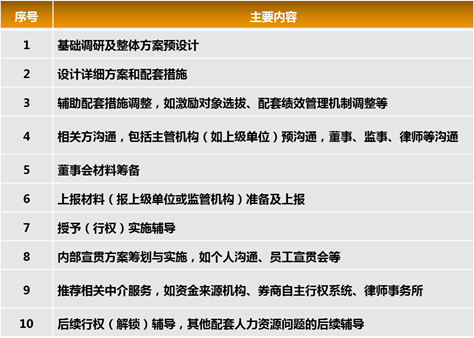 從全面激勵、長效激勵、股權激勵、公司治理和高管薪酬績效研究等專題出發,基于對中國國情、行業環境、企業戰略、業務發展、人才隊伍等方面的深入理 解,為企業設計針對性的股權激勵系統解決方案,從而幫助企業有效激勵核心人才,提高人力資本價值創造能力。股權激勵服務包括但不限于以下內容: