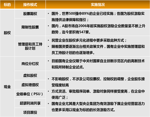 從國內外企業實施經驗來看,主要分為以股權或現金為標的的兩類激勵方式,常見的操作模式包括:
